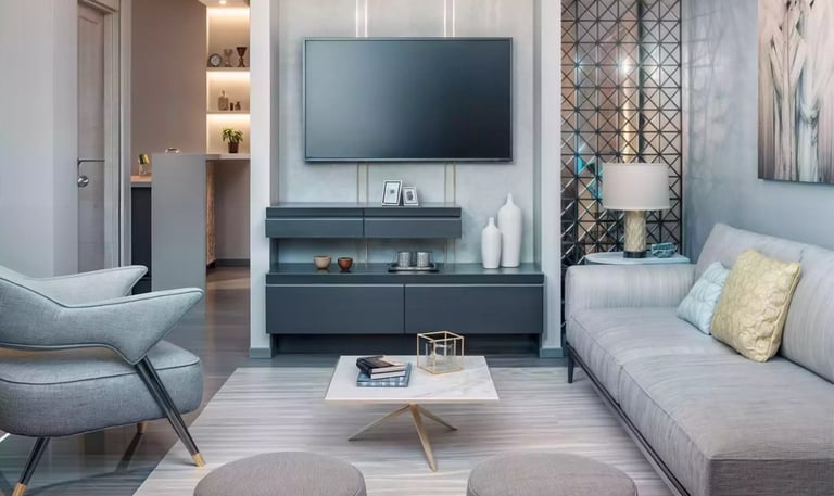 Este render permitió al cliente visualizar un salón versátil y elegante para su vivienda, respondiendo a la necesidad de un espacio social acogedor. Al integrar elementos modulares, paleta de grises contrastada con detalles metálicos y zonificación sutil, facilitó la aprobación del diseño y resaltó la funcionalidad de cada área.
